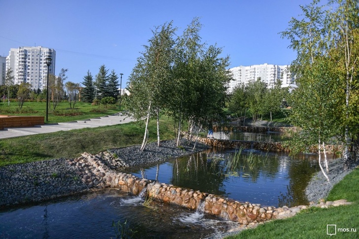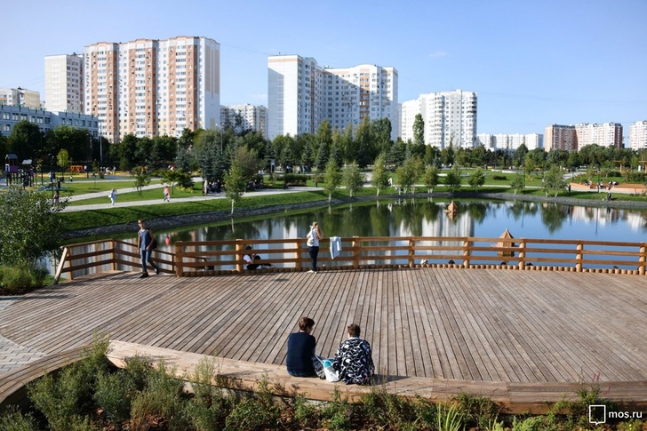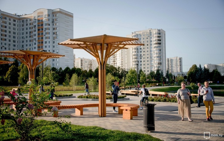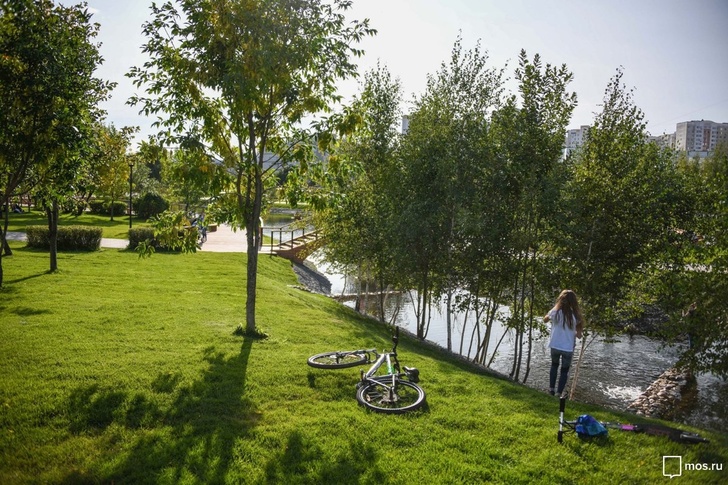 В парке также установлены перголы [увитые зеленью навесы], под одной из которых установлены подвесные качели. В парке также создано несколько комфортных зон отдыха у воды с понтонными деревянными причалами и пандусами-переходами.