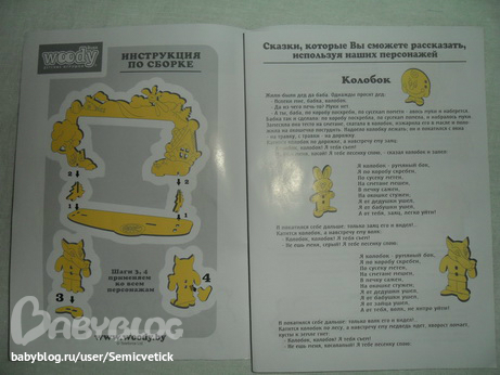 Персонажей всего 11. С их помощью предлагается разыгрывать 5 сказок - Колобок, Теремок, Курочка ряба (Золотое яичко), Заюшкина избушка, Лиса и медведь. В книжечке, которая тоже нашлась в коробке, приводятся тексты сказок, ежели кто их не знает. Оказалось, что я подзабыла сказку "Лиса и медведь", прочитав в книжке, вспомнила. Еще "Теремок" мы с дочкой читали в другом изложении - с мухой, комаром... Но "постановка" Теремка в нашем театре прошла успешно и без этих героев.