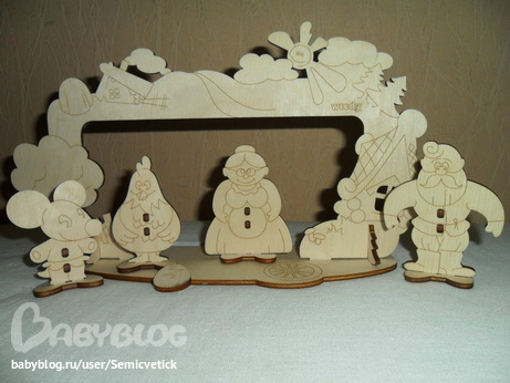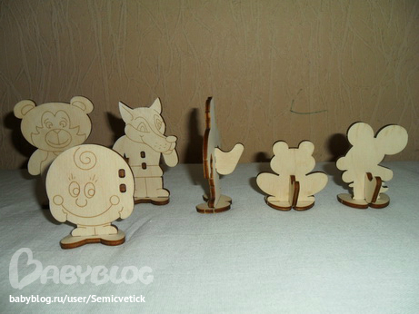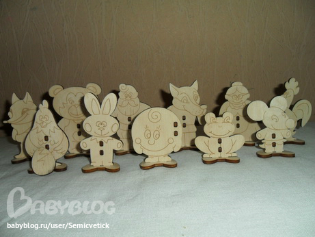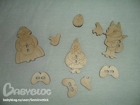 Фигурки были в разобранном виде, мы сами собрали - каждая состоит из 3-х частей: подставки, держателя и собственно самой фигурки персонажа. Из частей собирается и сама "сцена". После сборки детали держатся плотно, не выпадают. Одна деталь - яичко для сказки "Курочка ряба" ни к чему не крепится. Набор предназначен для раскрашивания карандашами, фломастерами или красками. Я не раскрашивала, делать это самой не вижу смысла, а дочка еще слишком мала, чтобы сделать это более-менее аккуратно, поэтому мы отложили эту процедуру на будущее
