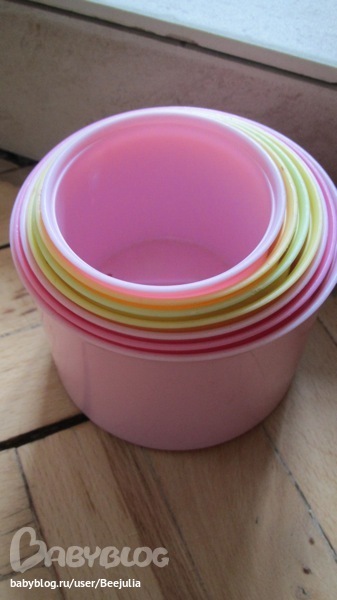 тоже очень хорошая игрушка. Строим башенку, разрушаем башенку, прячем один стаканчик и ищем его (закон сохранения), потом во время сортировки чего-нибудь их можно использовать как контейнер.
