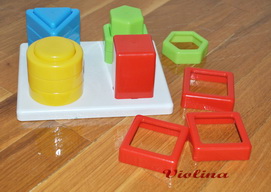 Сочетает в себе и пирамидку и сортер. Фигуры сортируются по цвету и форме.