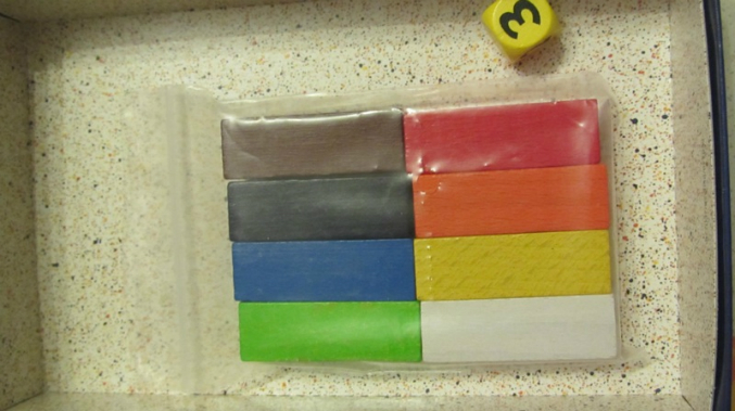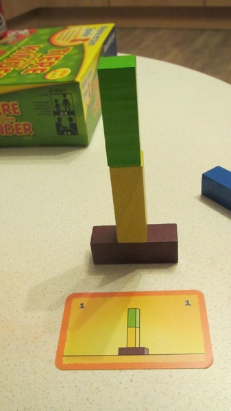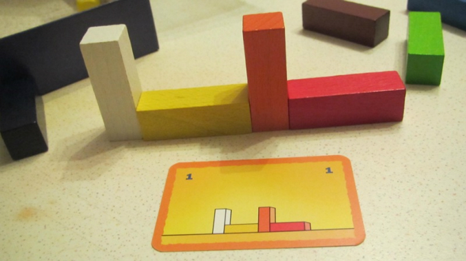 В дорожном варианте 8 прямоугольников разного цвета, деревянных, и карточки, разделенные на три уровня сложности.Цель игры составить из прямоугольников такую конструкцию какая представленна на схеме.