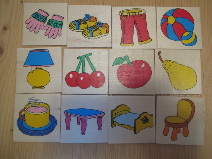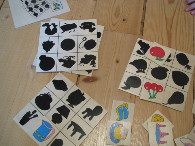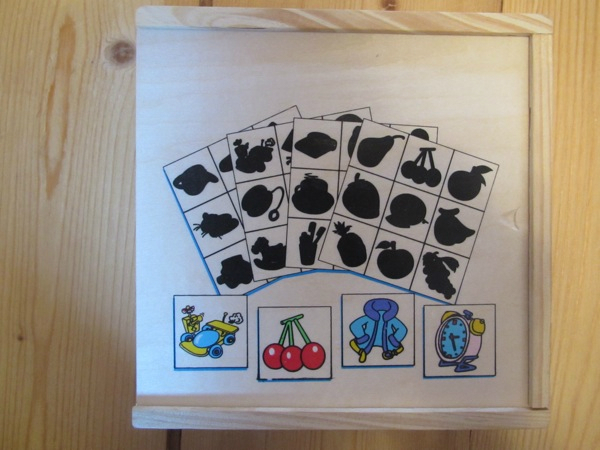 Смысл игры в том, чтобы найти тень предмета. В наборе 4 поля с тенью (одежда,, фрукты, мебель, игрушки.) и краточки с изображением самих предметов. Все сделано из дерева.