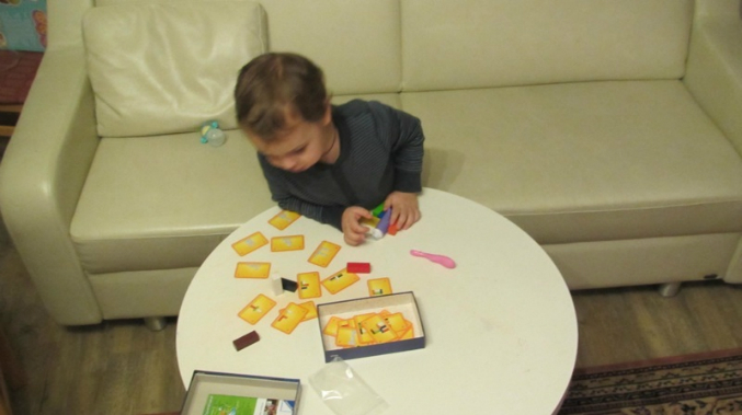 Игра эта у Степы не пошла, скорее всего это связанно с его особенностями в пространственно ориентации, ему очень сложно и соответственно не нравится,но так как она очень хорошо развивает межполушарное взаимодействие, то стараемся играть в нее почаще.
