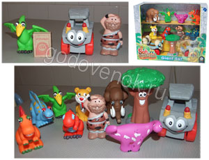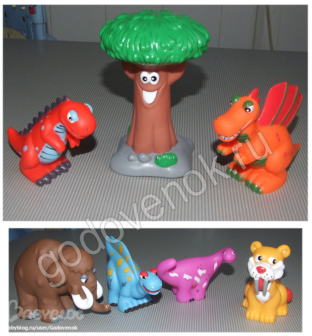 Всего в наборе 11 игрушек: 7 динозавров, 1 человек, 2 машины и 1 дерево.