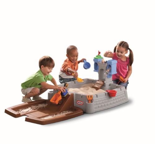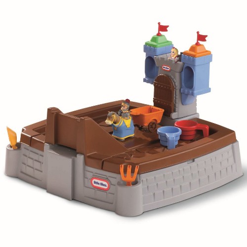 В комплект к песочнице со средневековым замком входят грабельки, лопатка, чашка для песка, сито для просеивания песка, рыцарь и принцесса, лошадь, телега, 2 формы для песка/ верхушки замка.