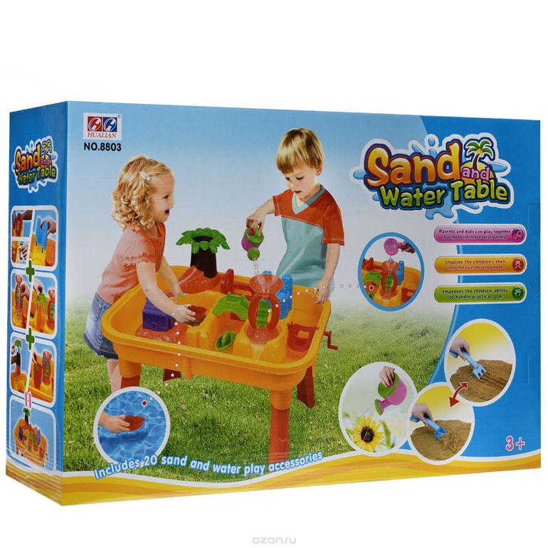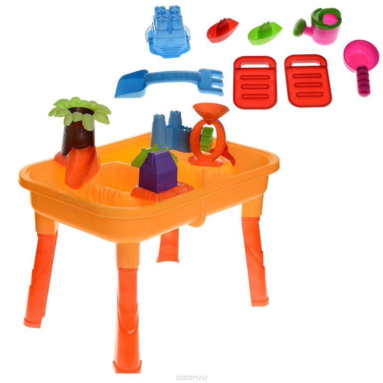 В комплект со столиком входят аксессуары для игр: ведерко, лейка, 2 кораблика, ковш, лопатка, 2 ворот, домик, мост, крепость, пальма, горка, воронка и дополнительные элементы.