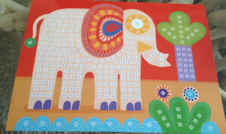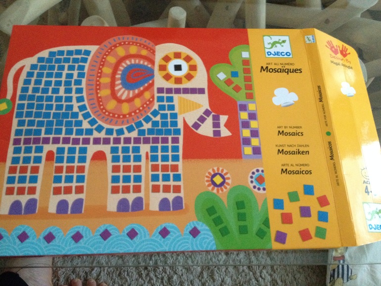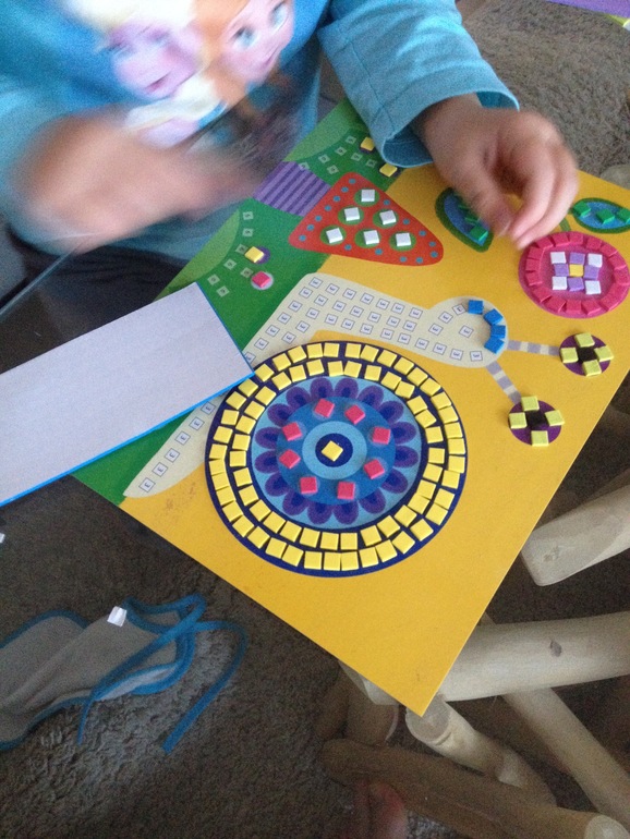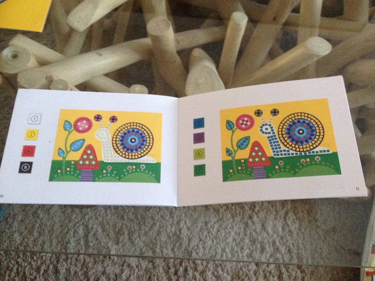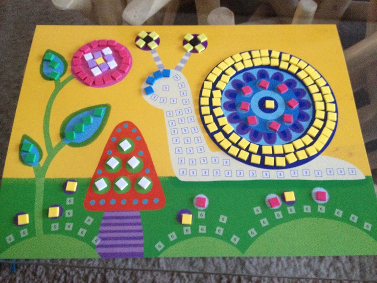 Данная мозаика состоит из 2х плотных листов с картинками, очень яркие. Задача, наклеить на пронумерованные квадратики соответсвующие цветные "подушечки". Почему подушечки, так как они объемные и мягкие.