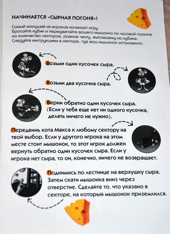 Крутим стрелку, в зависимости от выпавшего задания ставим мышку своего цвета левой или правой рукой, или снимаем чужую мышку, если выпал кот - прикрываем один глаз специальным кусочком сыра и пробуем поставить мышку на балансир)