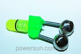 Вот на фото первый зеленого цвета идет светлячок-фонарик, он прикреплен к рогаточке (более темного зеленого цвета), у которой на концах бубенцы.