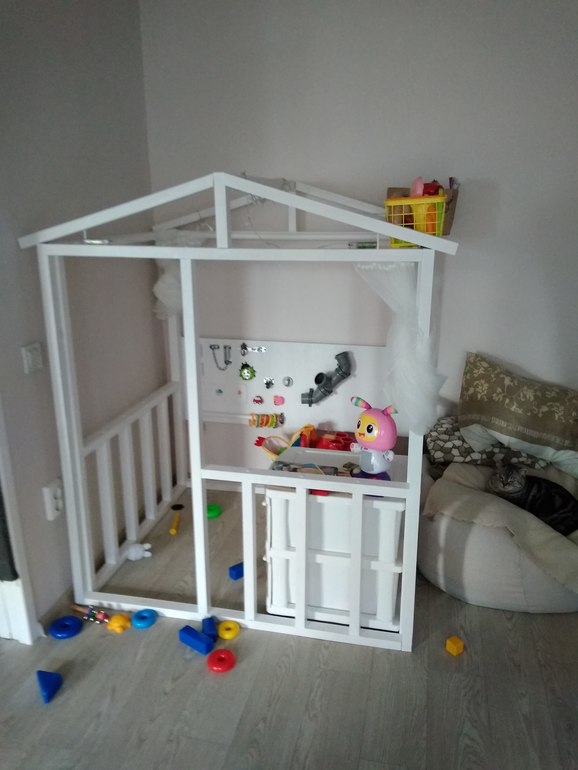 Собрал муж из реек, покрасили, поставили. Внутри на задней стенке бизиборд, крутил и всякие из строй- магазина. В домике комод с игрушками - дочь крутится вокруг, перила отбирает, на лампочки наверх смотрит. В общем со временем появился способ взаимодействия с домиком :) если забесит - разберём и в гараж