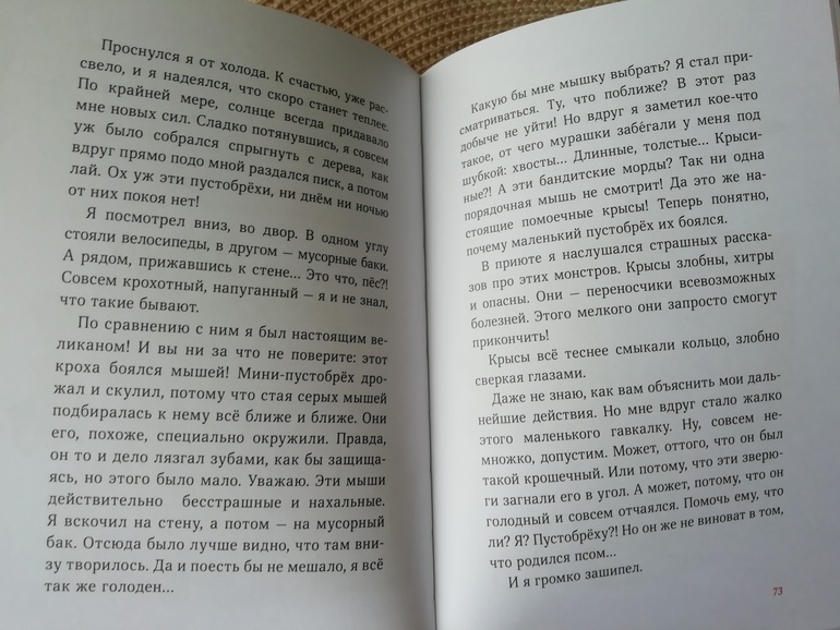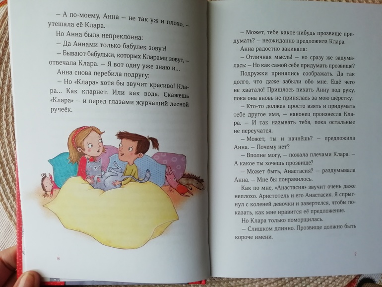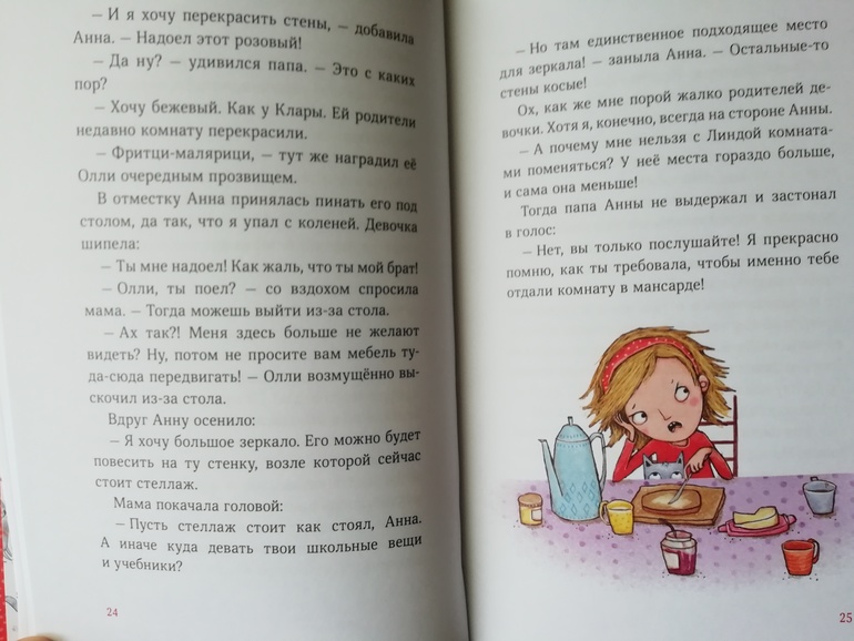 Вообще иллюстрации в книге довольно-таки милые и соответствуют тексту. Шрифт в книге крупный, она подходит для самостоятельного чтения. Дочка читает самостоятельно, но большое количество текста ее еще пугает, поэтому книгу читала ей я.