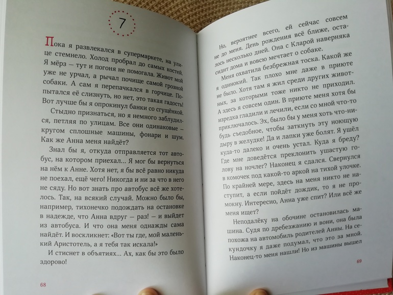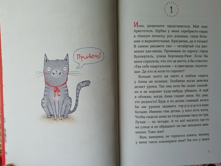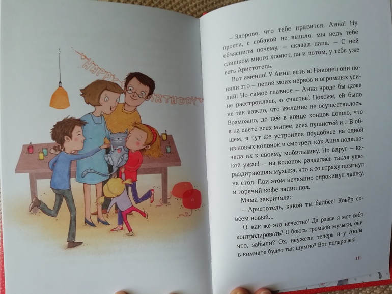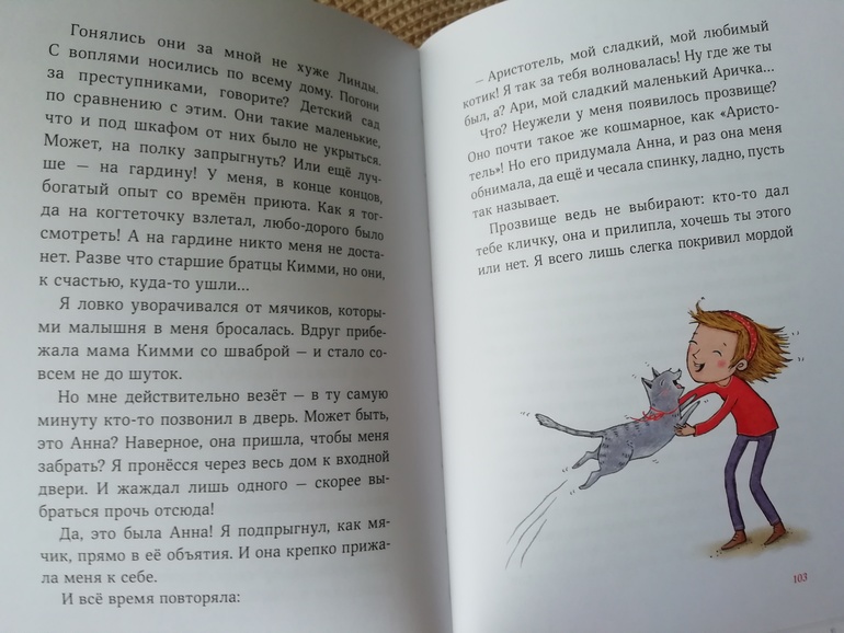 История смешная, местами трогательная и поучительная. Дочка хохотала над смешными моментами и переживала за Аристотеля, сможет ли он выбраться из приключения благополучно и вернуться домой к своей любимой хозяйке Анне. Кстати, приключение он сам себе и устроил, убежав из дома. По тексту многое можно обсудить с ребенком, начиная с того, что нельзя убегать из дома и заканчивая темой дружбы и преданности.
