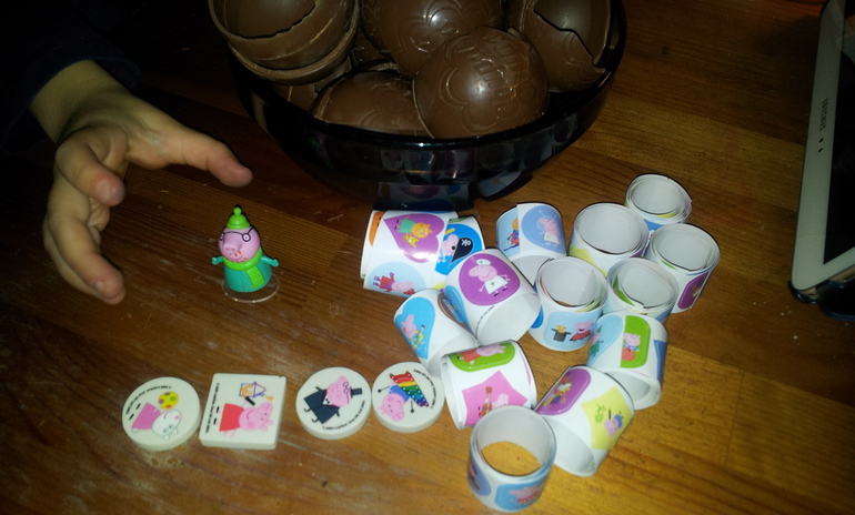У меня сын фанат мультика "Свинка Пепа" Увидел рекламу по телевизару как из яиц достают фигурки Пепы, и началось купи мама мне яичко. Долго искали по всем магазинам, нигде нету и тут случилось чудо в Пятёрочке выставили коробку,с радости купила всю в коробке 18 яиц, и вот что в было в яичках всей коробки: