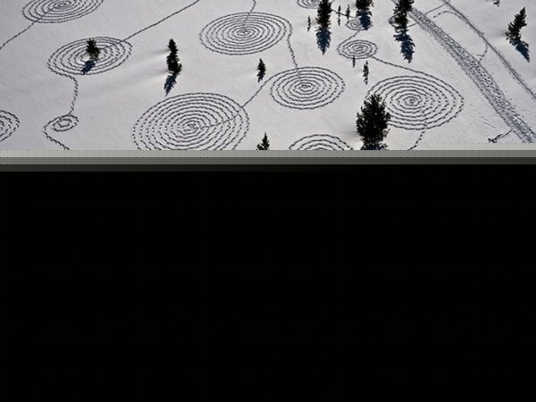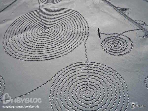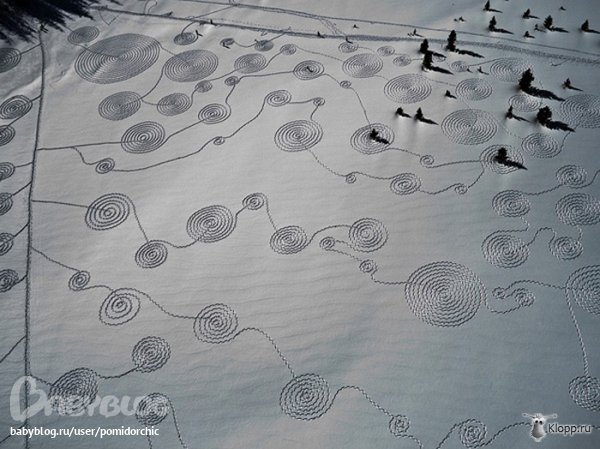 ДругоеАмериканская художница Соня Хинричсен (Sonja Hinrichsen)и пятеро ее помощников-добровольцев не сидели сложа руки, когда в январе над Колорадо прошел циклон, после которого леса, поля, равнины и горы завалило чистейшим и очень плотным снегом. Нет, они не играли в снежки и не строили снежные замки, вспомнив детство. Они рисовали на снегу эти самые орнаменты, используя самих себя в качестве инструментов для рисования.