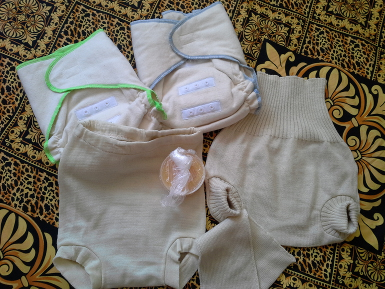 Слева- это тренировочные трусики. Да, они тоненькие, но проланолиненые очень хорошо держат. Их можно носить, как обложку на подгузы на день, а можно с вкладышами, как тренировочные. На ночной сон, конечно, лучше уже штанишки одевать. Сейчас в жару мы в этих трениках в слинге гуляем :) Попе хорошо, не жарко.