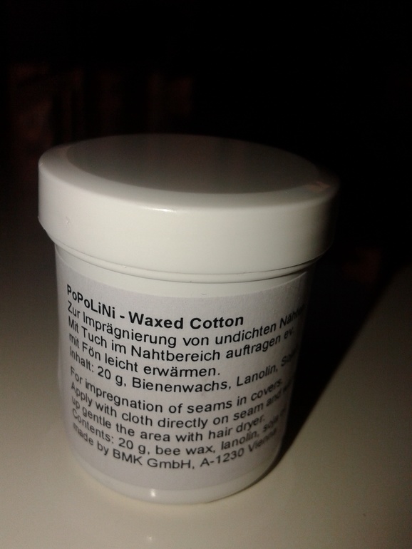For impregnation of seams in covers. apply with cloth directly on seam and warm up gentle the area with hair dryer. contents: bee wax, lanolin, soja oil.