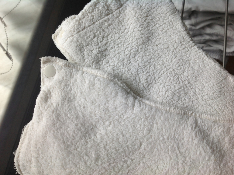 Уход за подгузниками.Уже много было постов о том, как добиться мягкости подгузников. Я давно для деликатной стирки покупаю средство "кашемир". Стоит копейки. Запаха почти не имеет. Вещи приятные и пушистые. Решила попробовать постирать им подгузники. Специально отложила один вкладыш, чтобы разницу посмотреть. Вот что получилось через неделю. На фото нижний вкладыш постиран кашемиром: