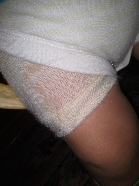 туда видимо попало большое количество ланолина..и так как штанишки тонкие-впиталось и видноно у меня к сожалению наппи тренировочные тк и не заработали.было однажды сухо-но тогда малыш просто пописал один раз в бендель