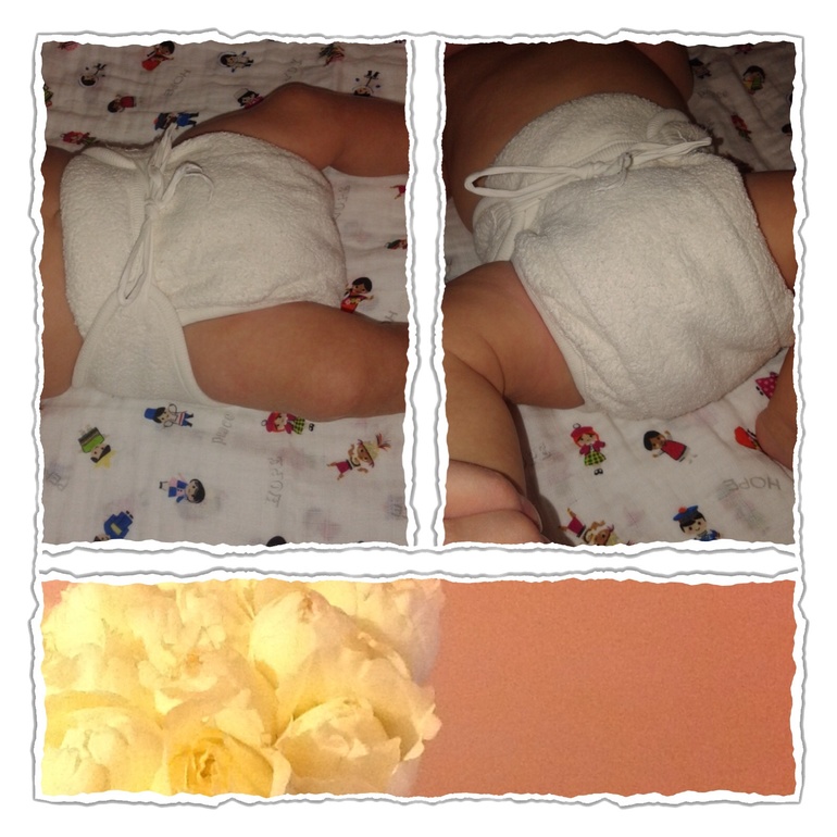 На следующих фотках ляжки немножко наели и подгузник уже не подвёрнут. Здесь нам месяц и примерно 5 кг. Завязки позволяют хорошо отрегулировать подгузник по малышу.