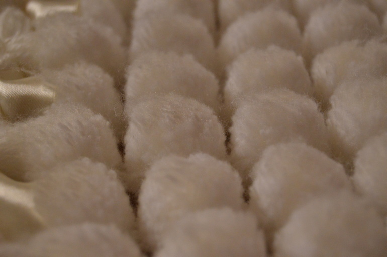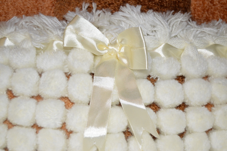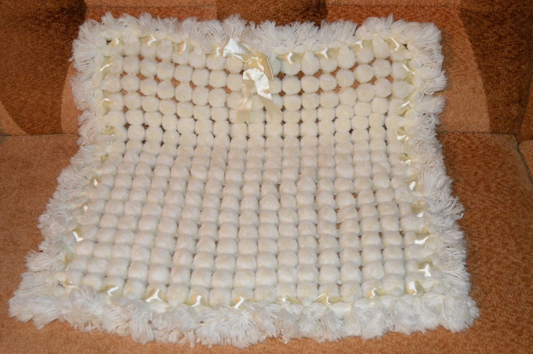 плед 70*70, внутренняя сторона 100% хлопок, помпоны 50-50 шерсть акрил..сама делала,чуть не умерла делала 2 недели,все пальцы были забинтованы.новый ни разу не укрывали малыша так и пролежал в комоде в пакете,забыли про него,делала в время беременности.ни за что бы не продала,жалко цена 2500.