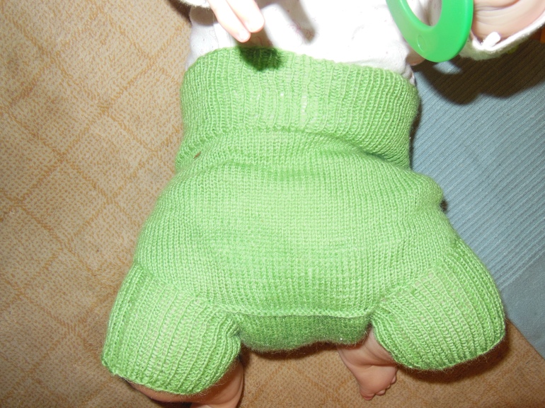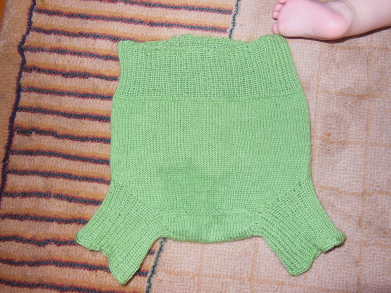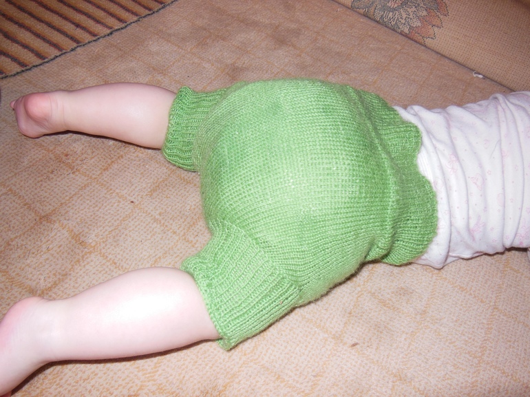 Спицы №2, нить в одно сложение. На лето получилось самое то. От трения и стирок свалялись в нужных местах, ночью не протекали (подгуз можно было отжимать). Но после стирки растянулись, я резинку на талии надвязала вверх и стянула крючком.