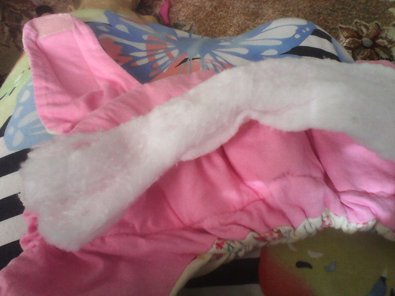 , вшит он по периметру вкладыша. Из того же любопытства холлофайбер извлекла, чтобы конструкция стала поменьше и на нашу попу натягивалась лучше.