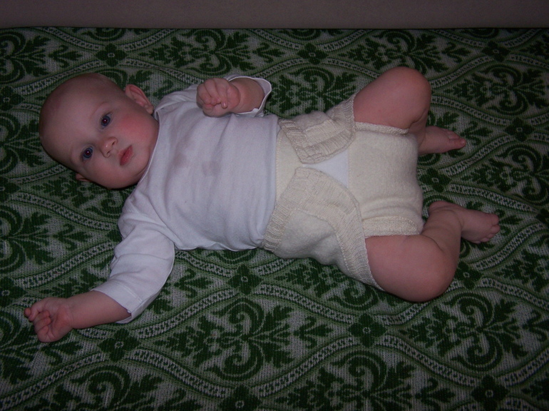 Тогда у нас была обложка из свалянной шерсти Дисана. Я люблю Диснау, просто обожаю. Но не все элементы. Люблю безумно их трикотажные подгузники на завязках, био-марлю, шелковые вкладыши, ланолиновый уход. Штаны тоже люблю (но теперь немного больше люблю другие марки). Подгузники на липучках и био-байка нравятся, но больше нравятся другие. А вот шерстяная обложка на липучках как-то не прижилась у нас тогда, посадка меня совсем не устраивала, к тому же липучка постоянно пыталась прилепиться к шерсти и этим меня ужасно нервировала; и сыночкам младшим покупать такую даже не стала.