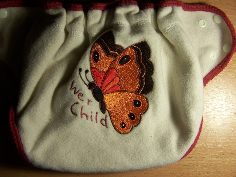 Потом мне захотелось обложку Бэбиидея с бабочкой. Это был опять неудачный опыт. Бабочка, конечно, классная. Но со второго расстегивания порвалась шерсть около кнопок. Ну кто догадался на такую нежную шерсть ставить такие тугие кнопки? В общем, функцию свою она выполняла, не протекала. Но посадка на ребенке мне тоже не нравилась, и даже фотографировать ее на ребенке не стала. Без ребенка она выглядит красивее.