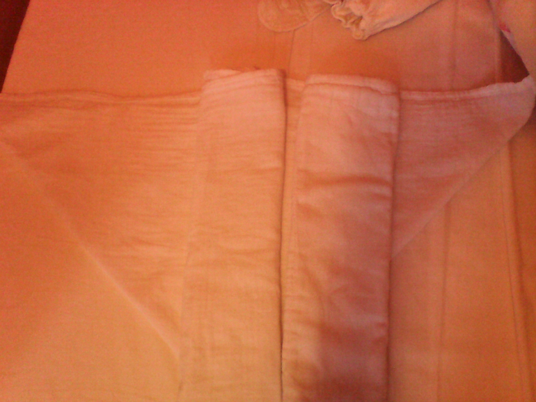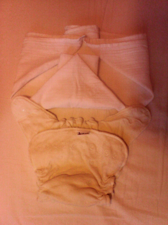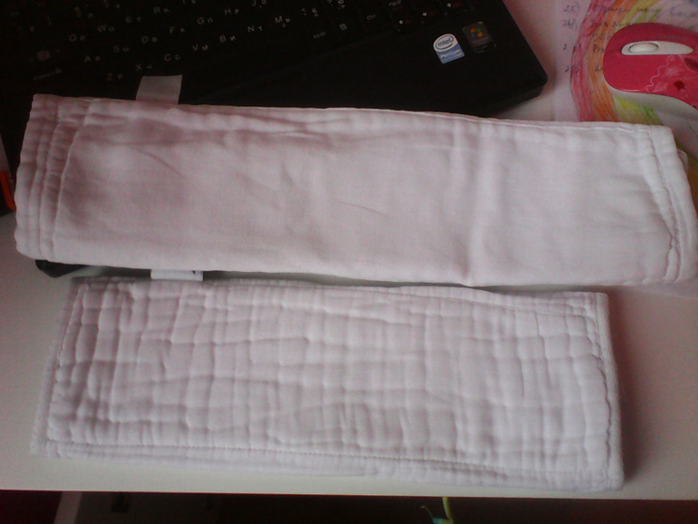 Префолд маленький, конечно в него нас не запеленать, но идеально ложится в подгузник фланелевый. Он мягче и тоньше родного вкладыша, а впитывает не меньше. Ткань такая же как и в пеленке муслиновой. И фото для сравнения с префолдом бамбино мио 2 размер.