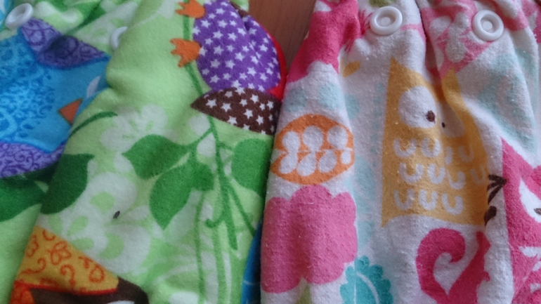Ну и последние фото как раз для сравнения нового подгуза (слева) и уже пользованного (справа). Усадки практически нет, фланель, конечно, стала уже чуть жёстче, но мы им не очень много пользовались.
