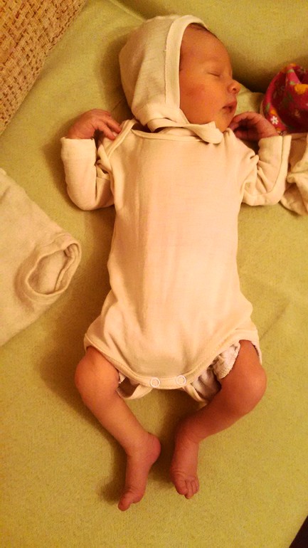 Дома мы ничего не носим кроме кофточек- распашонок и носочков. Комбинезон только на прогулки. Но он уже как поддева, а не в качестве термо. Комбинезон у нас merri merini, он мне очень пригодился в роддоме, тк служил непромокаемых покрытием, пол ним была роддомовская пелёнка , сложенная венгеркой. Фото из роддома - "злые" родители, спелинали как в психушке))
