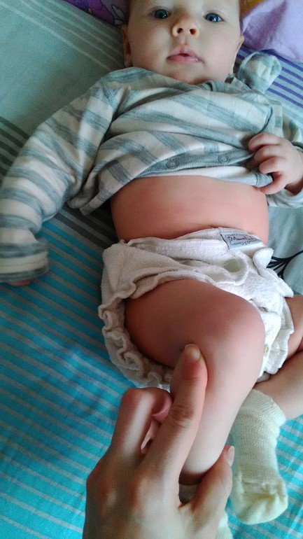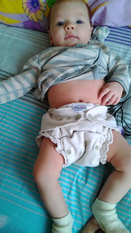 Теперь посадка на моей дочке 3 месяцев. К сожалению тут яобнаружела, что подгузник пришёл с брачком(( застегнуть его по высоте на самый маленький ращмер не получается, а именно он сидел бы на наших 5 кг идеально. Теперь фото в полузастегнуном виде)