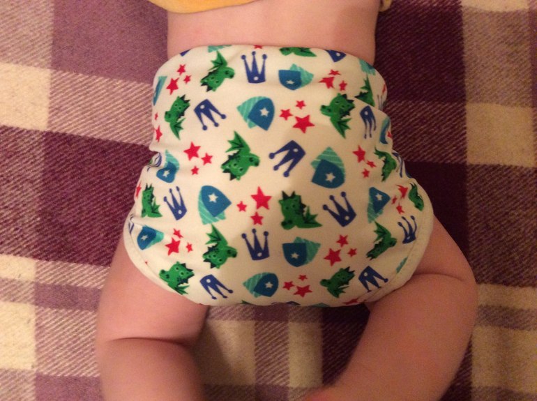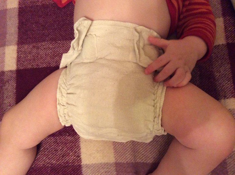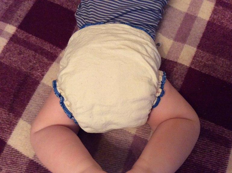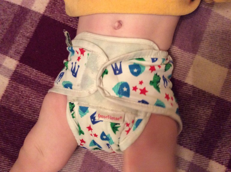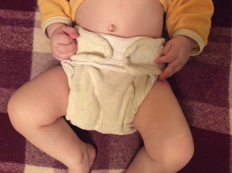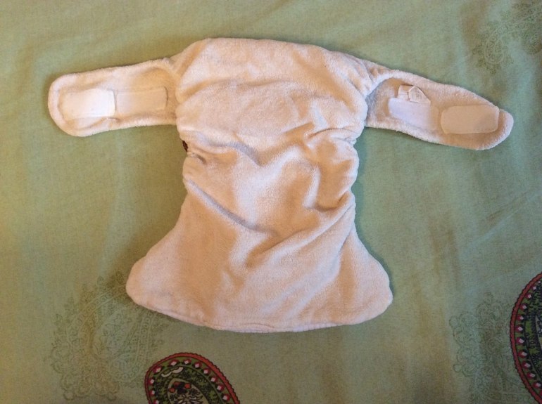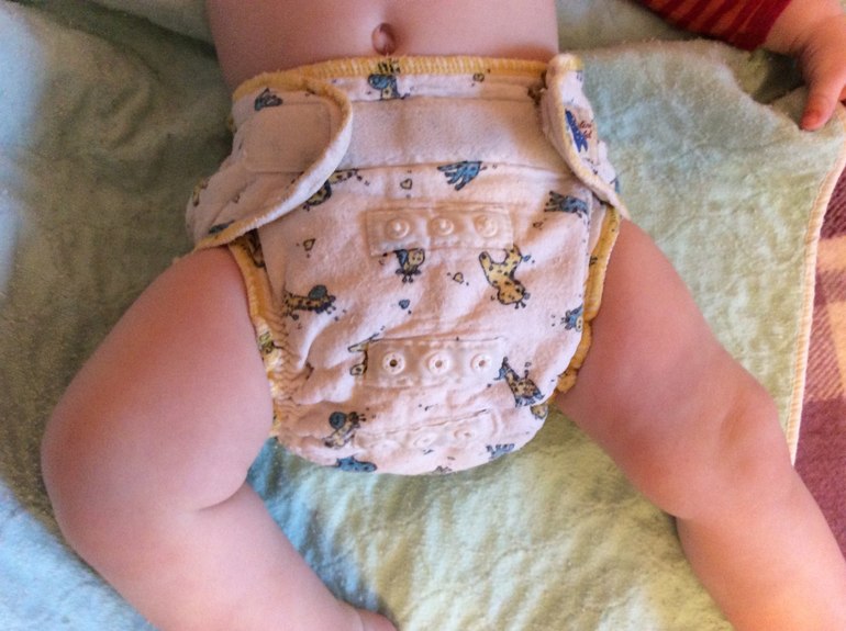 Мой первый и один из немногих подгузников с непромокаемым слоем (точнее, один из трех). Почему-то все фото спереди не очень удачные, но что есть: