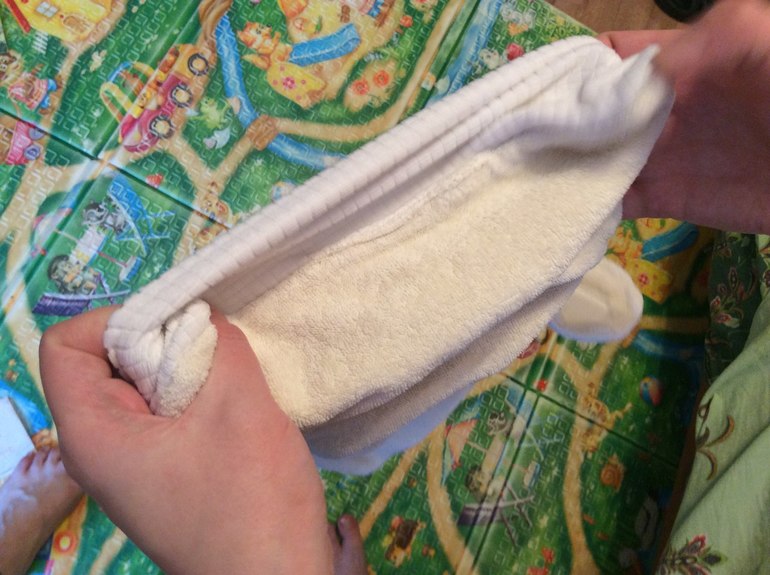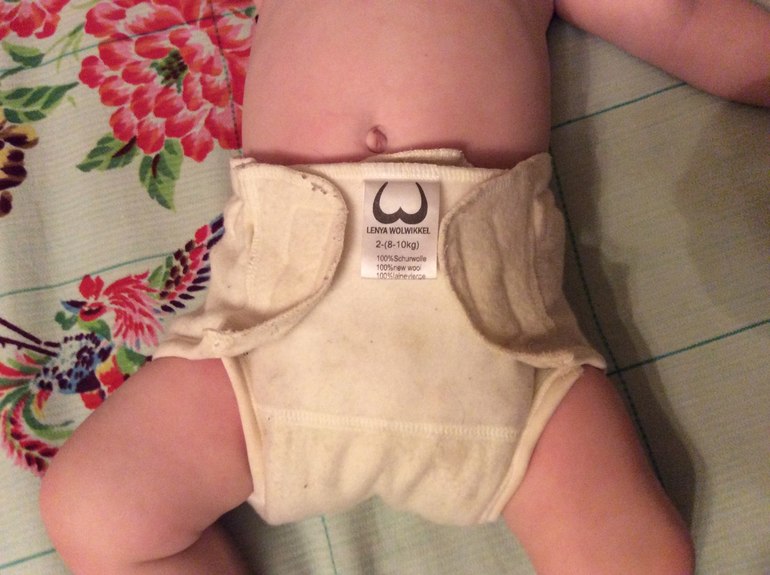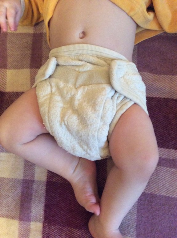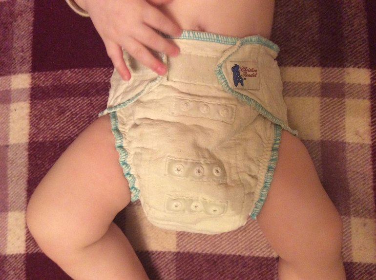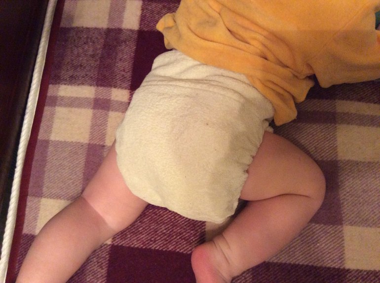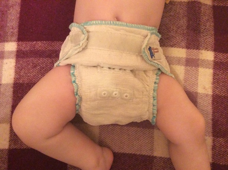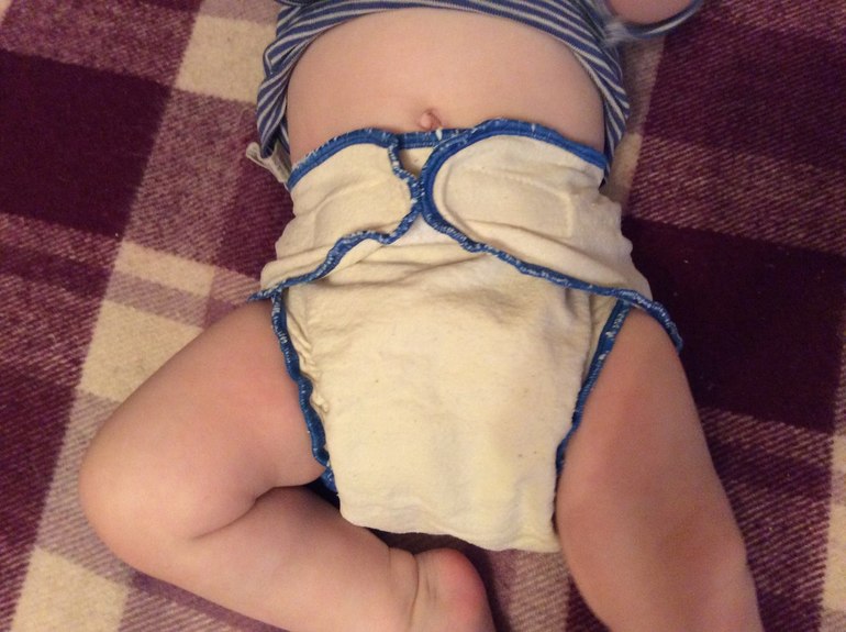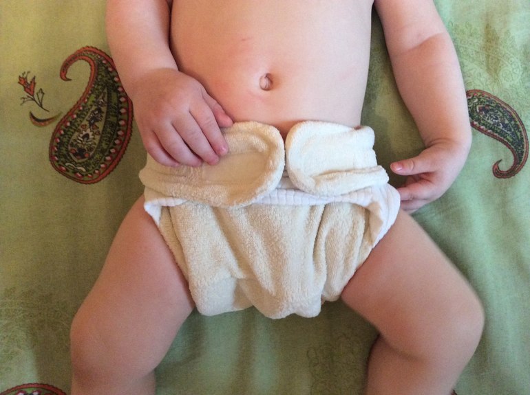 Мой первый и один из немногих подгузников с непромокаемым слоем (точнее, один из трех). Почему-то все фото спереди не очень удачные, но что есть: