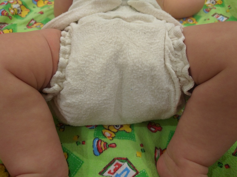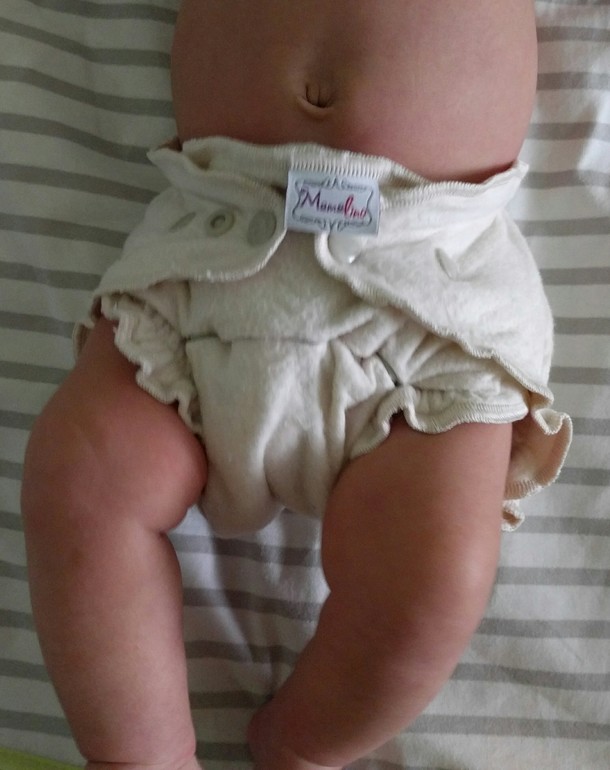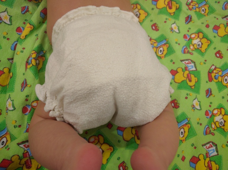 Это тот подгузник, который носится или сохнет, то есть постоянно в ходу. Мне нравится одевать его на прогулку (гуляем в слинге), так как хватает на часа полтора-два в сочетании с любым вкладышем и точно знаю, что малышу комфортно, нигде не натрет. При этом попа не будет оттопыриваться из-за обилия ткани. Если выходим в свет и планируются переодевания, но без хвастанья идеей МП, беру его.