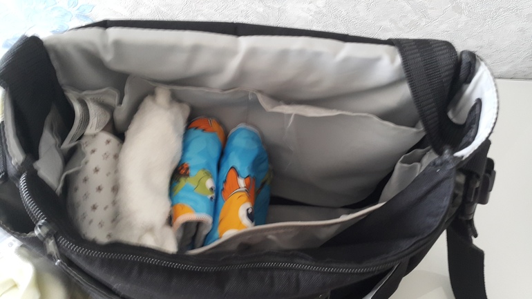 У меня сумка давнишняя еще от Кулы. там два отсека, но у меня не помещается все туда. Поэтому, в связи с тем, что сумка водонепроницаемая, я кидаю туда уже использованные подгузники. А вот чистые заворачиваю в обычную небольшую пеленку и в сумку свою обычную. У меня здоровенная такая, жу-жу-бишная, туда слон влезет. Там и лежат и чистые в пеленке и после использованные в мешке.