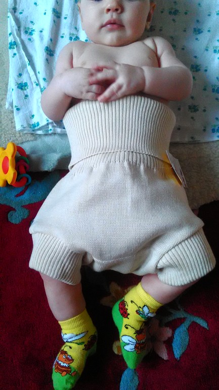 В целом сидит неплохо, хотя глядя на них я думала по-любому утонем)) ну лет до трёх нам их точно спокойно можно носить)) тк вязка безумно эластичная, но видно, что резинка возвращается в исходное положение, тк на Дизане или Пиратах после носки она становится в ровень со штанами по ширине, тут конечно надо испытать временем))
