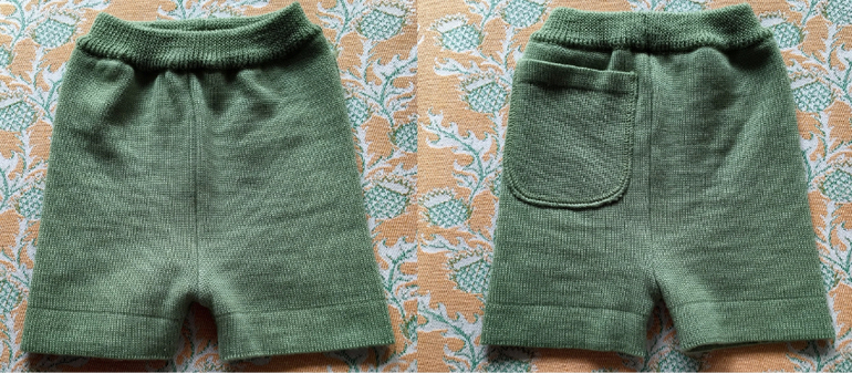 Итак, шортики из двухслойного, но в тоже время тонкого полотна на фото снаружи и с изнанки, а также с замерами до и после ручной стирки и обработки ланолиновым уходом.