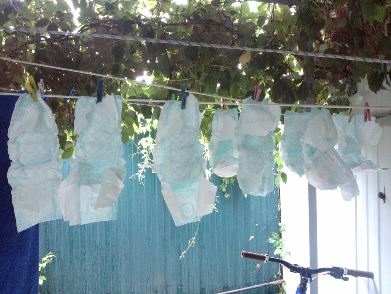 Вот собственно этим я и занимаюсь. Развешиваю одноразовые подгузы на улице проветриваться. Испражнения от больного ребенка пахнут еще более неприятно, чем пачка с ОП. У нас жара, напор воды плохой, помыться можно нормально только после 10-11 часов вечера. Машинка стиральная не программируется на режим с отсрочкой.