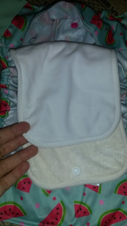 Внутри по описанию вшиты 3 слоя микрофибры, и сверху пришит вкладыш, к ребенку стай драй микрозамша, внутри микрофибра 1 слой я так поняла, и с обратной стороны как китайцы говорят "бамбуковый хлопок ".