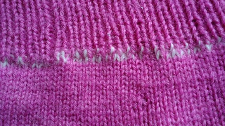 И у меня переход от лицевой глади и резинки получался рыхлый, поэтому я добавила еще одну нить)