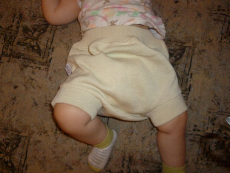 Расскажу еще про мамалино фреш. Я беру их уже второй раз. Штанишки размером 74-80, которые я покупала в апреле, до сих пор носим как пеленальные. Они изрядно свалялись и держат хорошо, однако сзади высоты немного не хватает. По ширине же запас еще остается, еще месяц-два поносим. Манжеты плотные, очень эластичные, ножку облегают и почти не растянулись в отличие от вайзмам и наппи с высоким поясом. В общем, эти штанишки - отличный вариант на день, да и на ночь их надеть в принципе тоже можно, особенно если покупались они с запасом.
