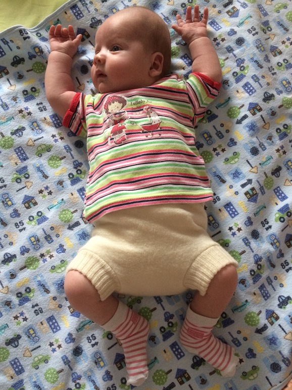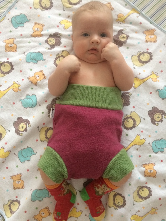 Вот лялька в двухслойных наппи на резинке размера 74-80 в 2 недели: