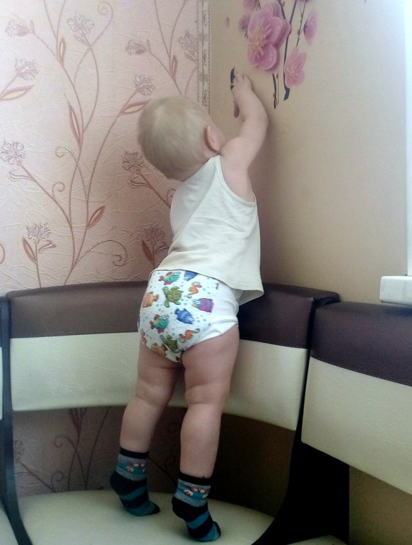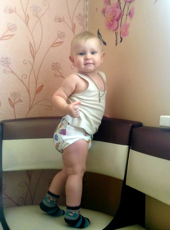 Подгузник очень мягкий, прям будто воздушный. Вкладыш двойной, благодаря чему быстро сохнет. У меня сын, поэтому нижний слой вкладыша я подвернула спереди. В сам подгузник тоже вшит вкладыш. Днём испытать не удалось, так как сын проснулся сухим, будем испытывать на ночь:) вот так он сидит на наших около 12 кг;