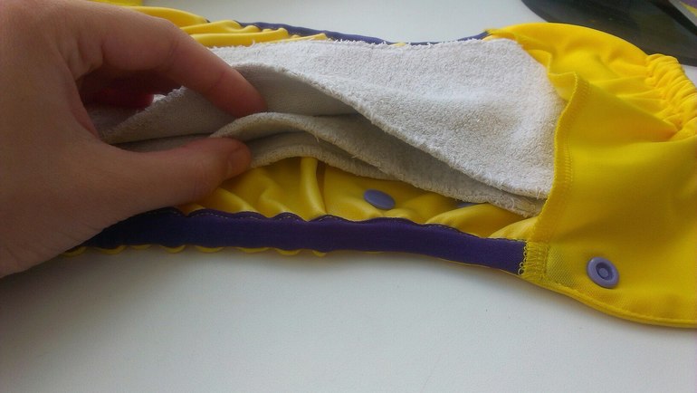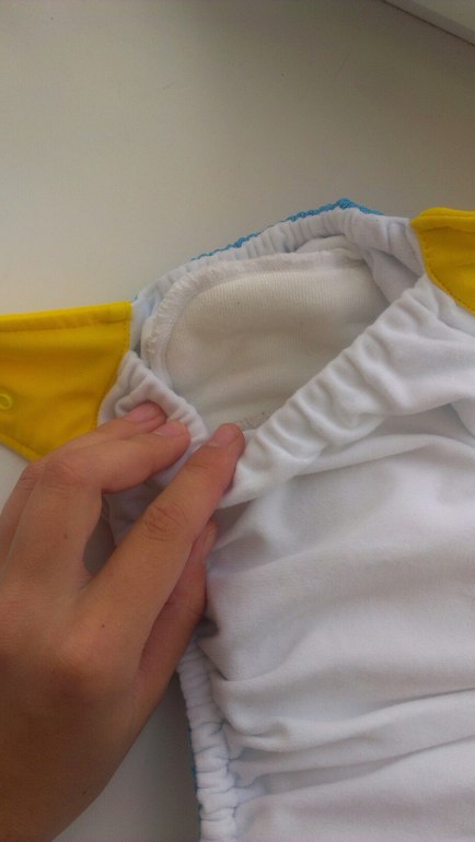 По подгузнику:очень мягкий, очень легкий, посадка просто сказка, очень хорошо что сделали узкую ластовицу-во всех бы дневных подгузах так)) Как впитывает тоже очень нравится-ходим в нем часа 2 а то и 3!!! Благодаря микрозамше тело остаетя сухим, малышу комфортно в нем!) Еще один плюс -карман! ничего не сминается и не сворачивается, вставил вкладыш и все! Стираю руками жидким детским мылом, не пахнет, быстро сохнет. ТОлько ушки дольше сохнут так они из более плотного материала. Кстати очень интересно Женя с ними придумала!!! Ушки из элластичной ткани, что дает лучшую посадку.Вот фото подгузника внутри.