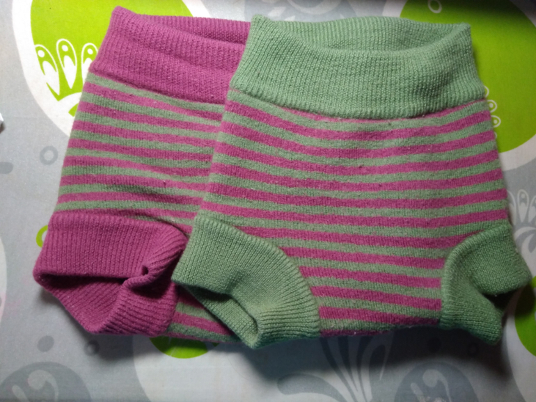 На новогодней распродаже купила я у пиратов двухслойные шерстяные штаны в двух размерах - М и L. Пользовались мы этими штанишками: М-кой как дневными штанами, L-кой на ночь, так как они были все же немножко пошире и повыше, и все было отлично, пока пару недель назад я не обратила внимание, что при одевании на ночь нашей обычной конструкции подгузник торчит. Начала я разглядывать свои штанишки и сравнивать, и вот что углядела: