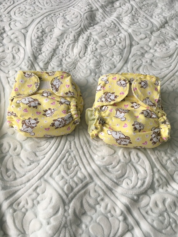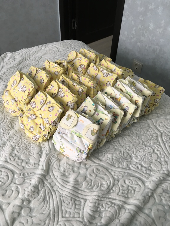 Шила двух видов. Одни резинками наружу другие резинками вовнутрь. На фото один и тот же размер. Шила из футера с начесом- желтые и фланель -беленькие. внутренний слой фланель желтая. короче то что нашла в магазине. у нас тут не сильно то с тканями разгуляешься. В зоне пописа каждого подгузника вшито 3 слоя той же желтой фланели и слой плащевки, чтобы не так быстро протоками в зоне пописа. Плащевка вшита только в зоне пописа чтобы не создавать парниковый эффект. Так что кожа все рано будет дышать.