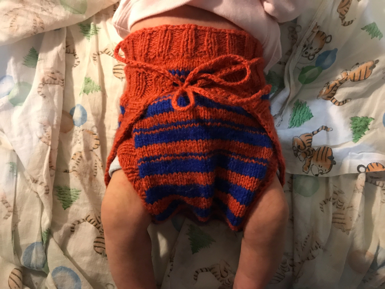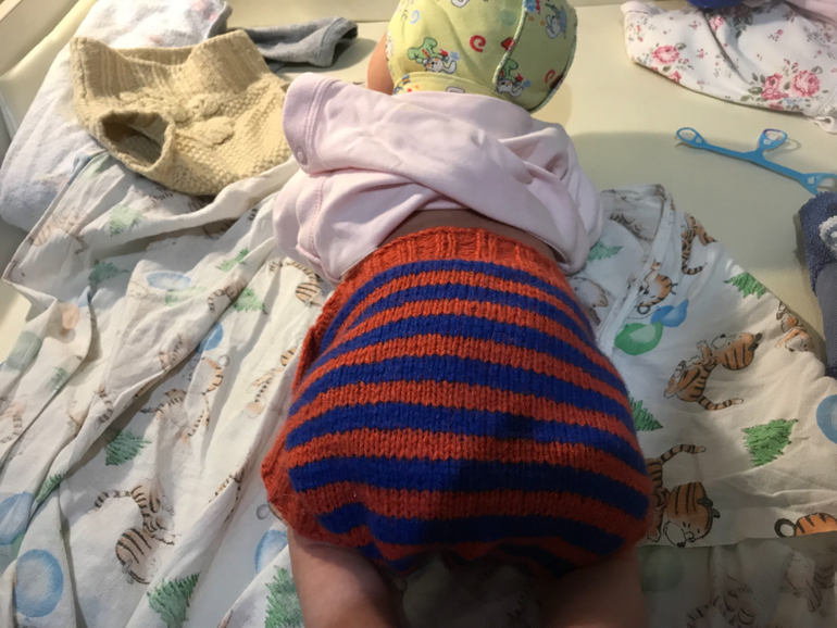 Подгузник своими рукамиПривет. Есть у нас напомник самовяз шортиками. Пользуемся, но на на малышку натягивать не удобно. Захотелось мне чтоб одевать проще было. Решила не изобретать велосипед, а сделать по типу Дисановского подгуза. У меня форма отличается, но смысл примерно тот же. Вот связала, постирала, проланолинила и не дождавшись когда просохнет уже на малую примерила☺️.