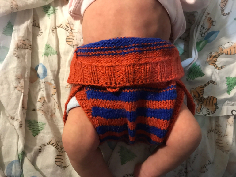 Симпатичный получился! Не должен пока протекать. Пробуйте, испытывайте. Мне лично удобнее всего были обычные классические штанишки. А кому-то нравятся больше обложки на липучках, кто-то вяжет по типу шерстяной юбки, кто-то мешками спальными с такими крохами пользуется.
